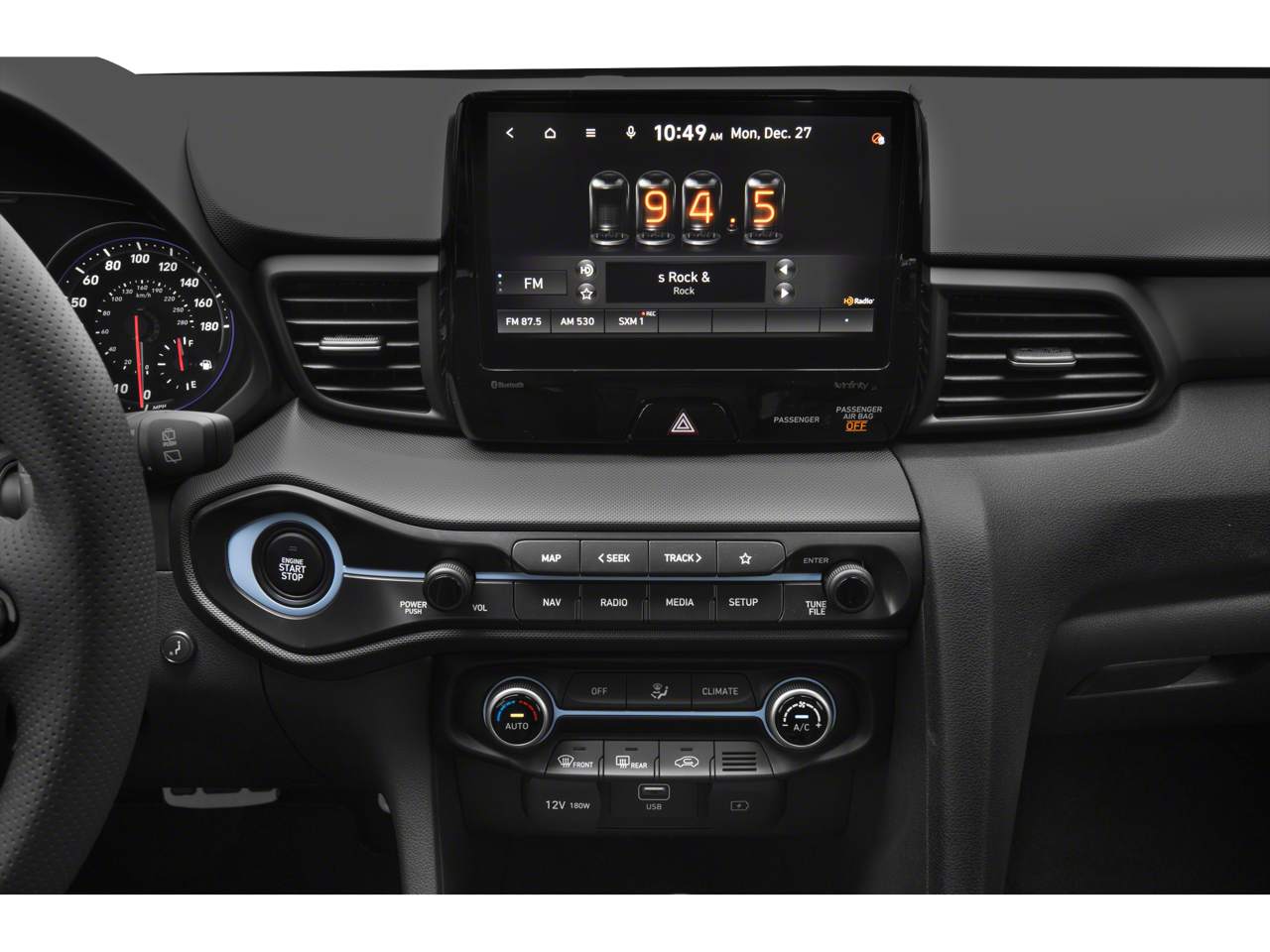 - Radio: AM/FM/HD/SiriusXM Infinity Premium Audio -inc: 8" display navigation 5.0, N specific menus, 8 speakers including subwoofer w/external amp, Bluetooth® hands-free phone system w/voice recognition, Apple CarPlay and Android Auto, dual charging USB ports (1 data and 2 power), speed-sensitive automatic volume control and Blue Link connected car system