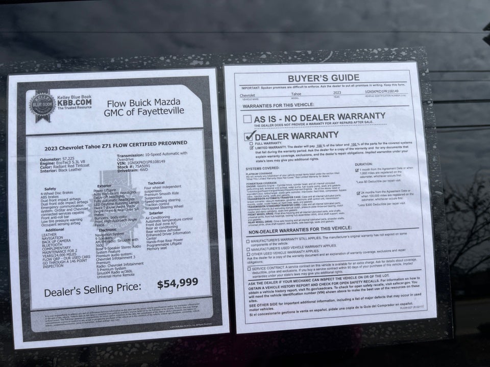 Flow Buick Mazda GMC of Fayetteville is very proud to offer this superb 2023 Chevrolet Tahoe Radiant Red Tintcoat Z71 with the following features: FLOW CERTIFIED 2YR/100 000 MILE POWERTRAIN WARRANTY 3 day money back guarantee and a free maintenance package! ** LEATHER NAVIGATION BACK UP CAMERA Bluetooth® COMPLIMENTARY MAINTENANCE FOR 2 YEARS/24 000 MILES FLOW QRP - OUR USED CARS GO THROUGH A 146 POINT INSPECTION Tahoe Z71 FLOW CERTIFIED PREOWNED 4D Sport Utility EcoTec3 5.3L V8 10-Speed Automatic with Overdrive 4WD Radiant Red Tintcoat Black Leather 1st & 2nd Row Color-Keyed Carpeted Floor Mats 2-Speed Active Electronic AutoTrac Transfer Case 2nd Row Pwr Release 60/40 Split-Folding Bench Seat 3rd Row 60/40 Power-Folding Split-Bench Seat Auto-Dimming Inside Rear-View Mirror Black Tubular Assist Steps Bose 9-Speaker Stereo Audio System Feature Bright Front & Rear Door Sill Plates Color-Keyed Carpeting Floor Covering Driver & Front Outboard Passenger Airbags Driver Alert Package Enhanced Driver Information Center Floor Console w/Storage Area Front High-Approach Angle Fascia Hands-Free Rear Power Programmable Liftgate HD Surround Vision Heated 2nd Row Outboard Seats Heated Steering Wheel Hill Descent Control Infotainment Display Lane Change Alert w/Side Blind Zone Alert LED Daytime Running Lamps Luxury Package Memory Settings Memory Settings for Driver Navigation System Outside Heated Power-Adjustable Mirrors Power Tilt & Telescopic Steering Column Preferred Equipment Group 2Z7 Rear Cross Traffic Alert Rear Pedestrian Alert Red Horizontal-Mounted Recovery Hooks Remote Start SiriusXM Radio w/360L Universal Home Remote Wireless Charging Wrapped Steering Wheel.